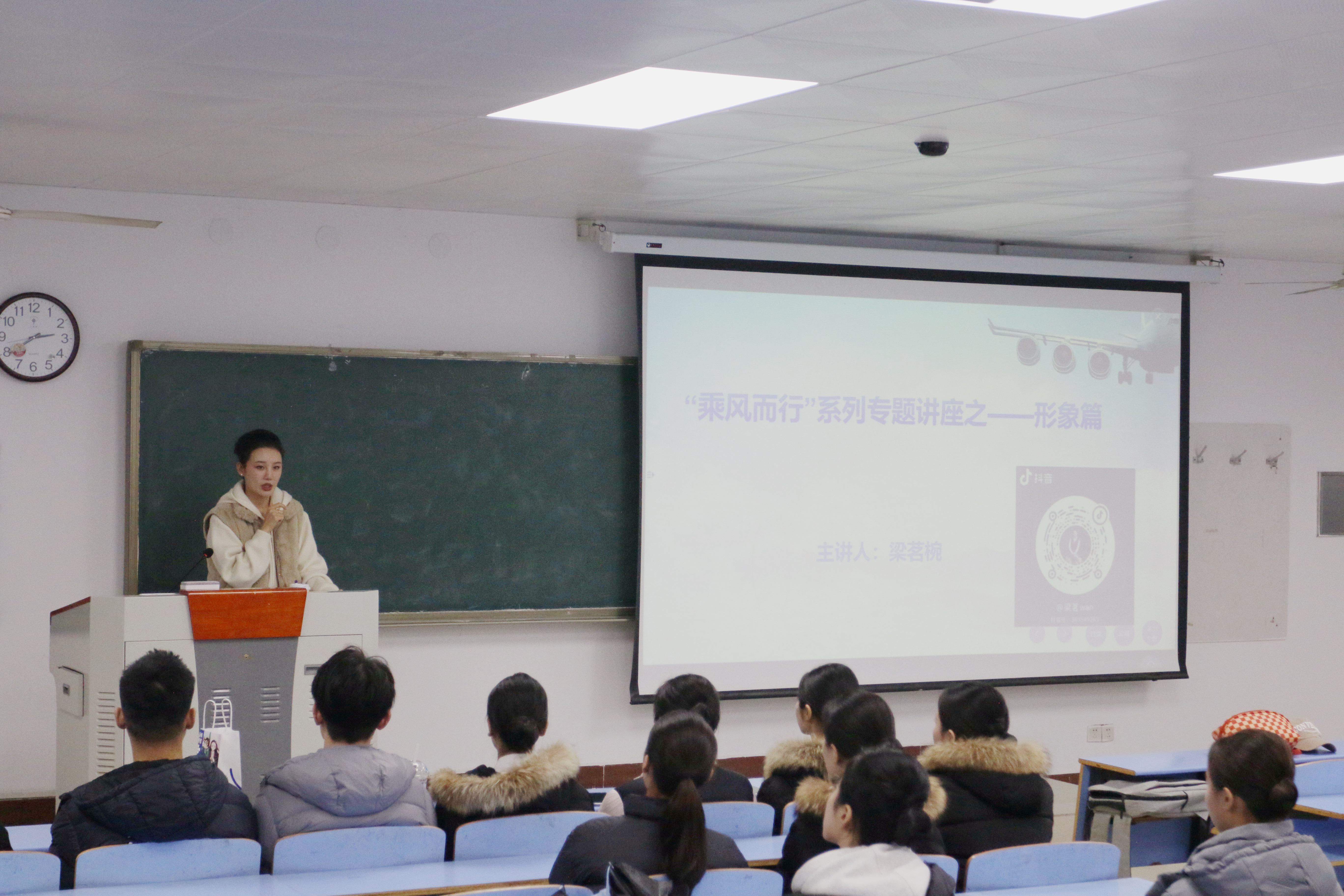 讲座主要围绕三个部分展开。一是讲解面试准备,梁茗椀根据自己乘务培训13年的经验,就面试前皮肤状态保养、面试妆容、专业知识准备及特长展示技巧进行了详细讲解。二是讲解面试流程,根据中国南方航空公司的面试要求及流程,从体态、表情、坐姿、手势等礼仪细节逐一示范。她强调,面试是长期积累的成果展现,要把皮肤保养、体态控制等工作在平时做好,在面试时才能以更自信的状态展示自己的优势。三是鼓励展示自己,梁茗椀结合自己面试时的经历,强调要抓住机会,大方展示自己的特长,展现大学生的朝气蓬勃。(25060801班 党世昌/图文)